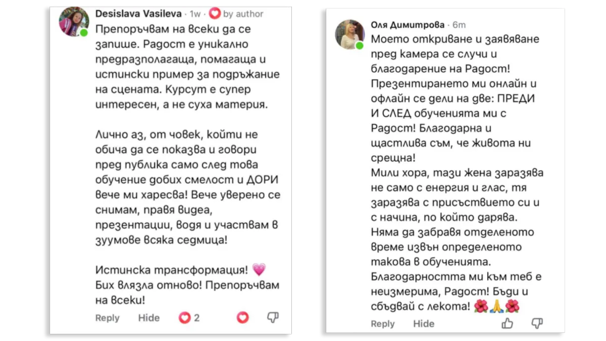 Гласът, тялото и думите трябва да казват едно и също едновременно. Ще научиш как да ги наредиш в синхрон - независимо дали записваш видео или представяш на сцена пред стотици хора.